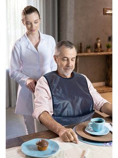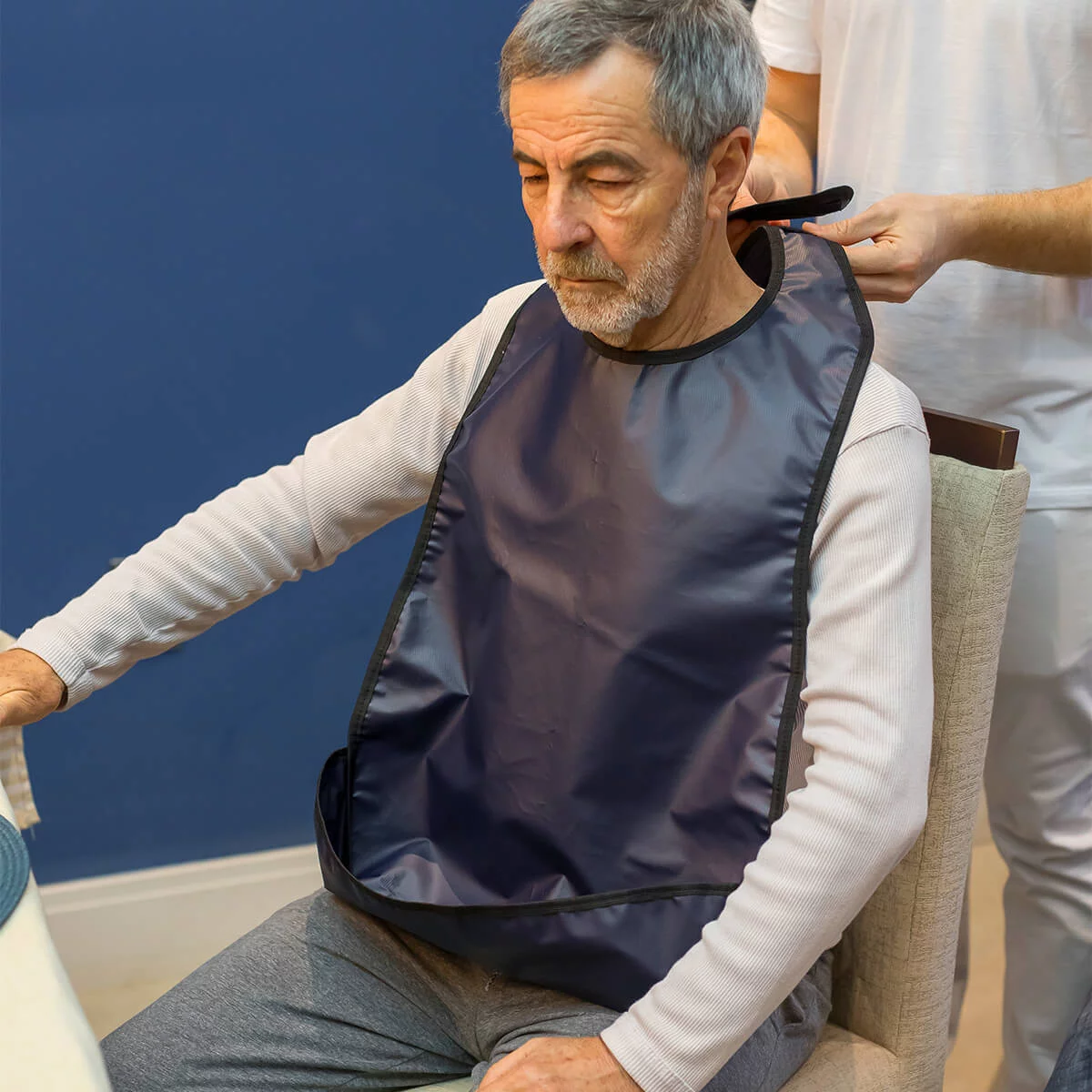 O Babador Adulto Idoso Avental Impermeável tipo Canguru Perfetto Mobilittà facilita o momento das refeições. Ele impede que líquidos e alimentos sujem a roupa. Isso reduz trocas de roupas e banhos extras.