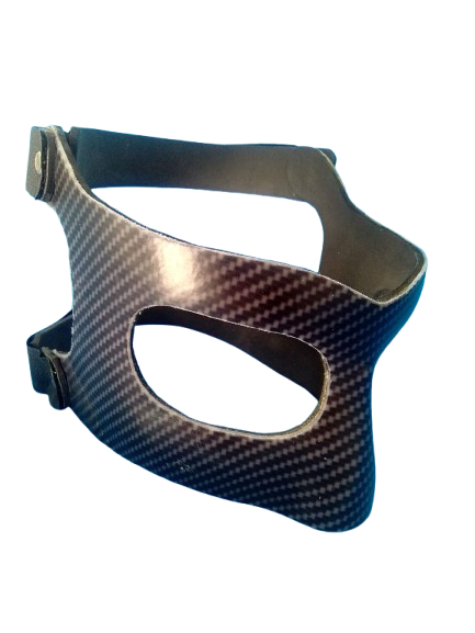 Máscara facial sob medida em polipropileno, indicada para proteção em lesões faciais, especialmente no nariz. Muito utilizada por atletas de futebol e outros esportes de contato.
