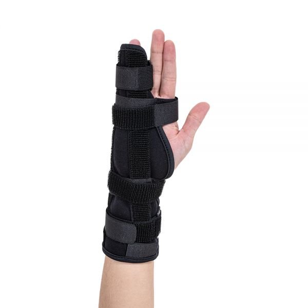 A tala foi desenvolvida em tecido de neoprene macio, leve e lavável, garantindo conforto durante o uso. Possui duas hastes rígidas de alumínio removíveis, que proporcionam estabilidade desde o punho até os dedos, mantendo o posicionamento correto da mão.