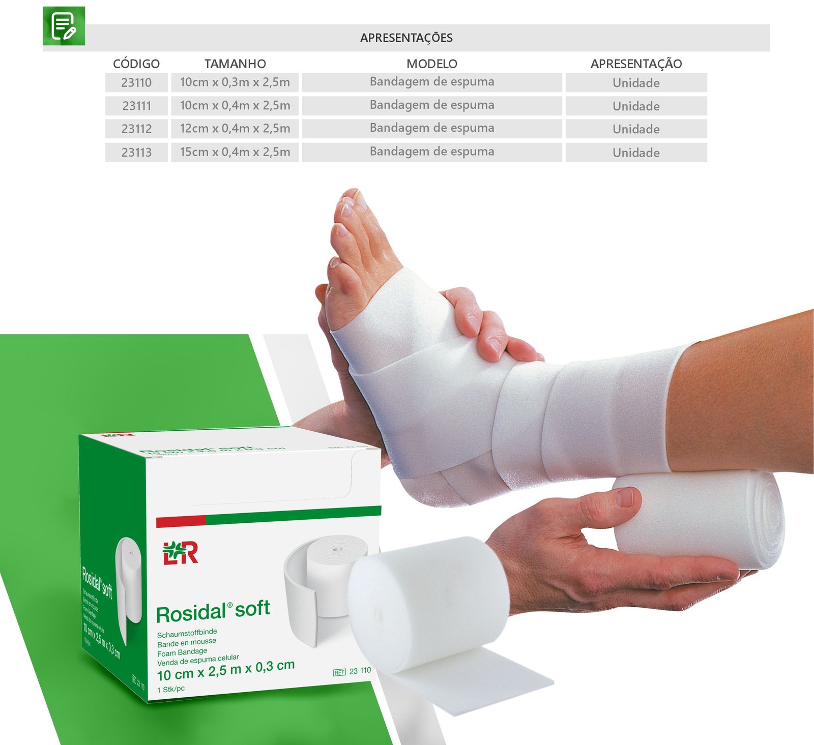 A Rosidal® Soft é uma bandagem de espuma de poliuretano, desenvolvida para atuar como camada de proteção e uniformização sob bandagens compressivas. Seu uso é amplamente indicado em tratamentos das áreas de linfologia e flebologia, além de aplicações ortopédicas e proteção de curativos.